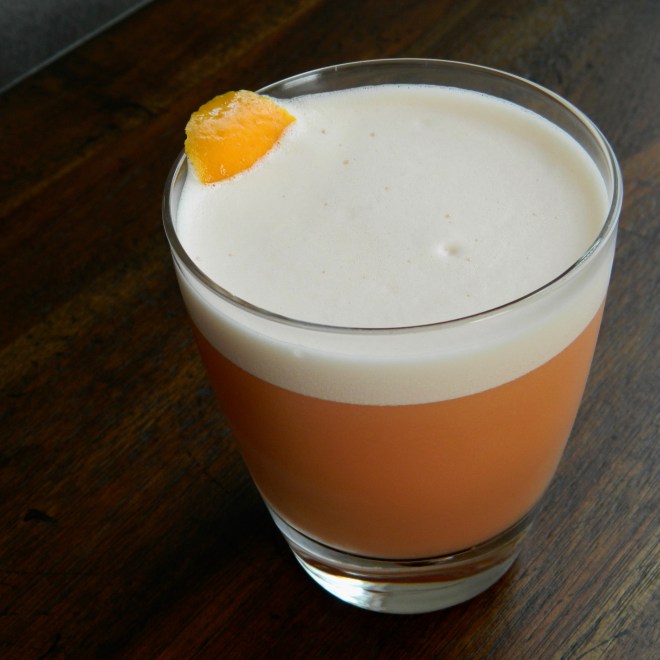 Add ingredients to shaker. Shake hard without ice for 20 seconds. Add a big cube and a few small cubes of ice (#science). Shake for another 30 seconds. Fine strain into a rocks glass. Garnish with an orange peel.